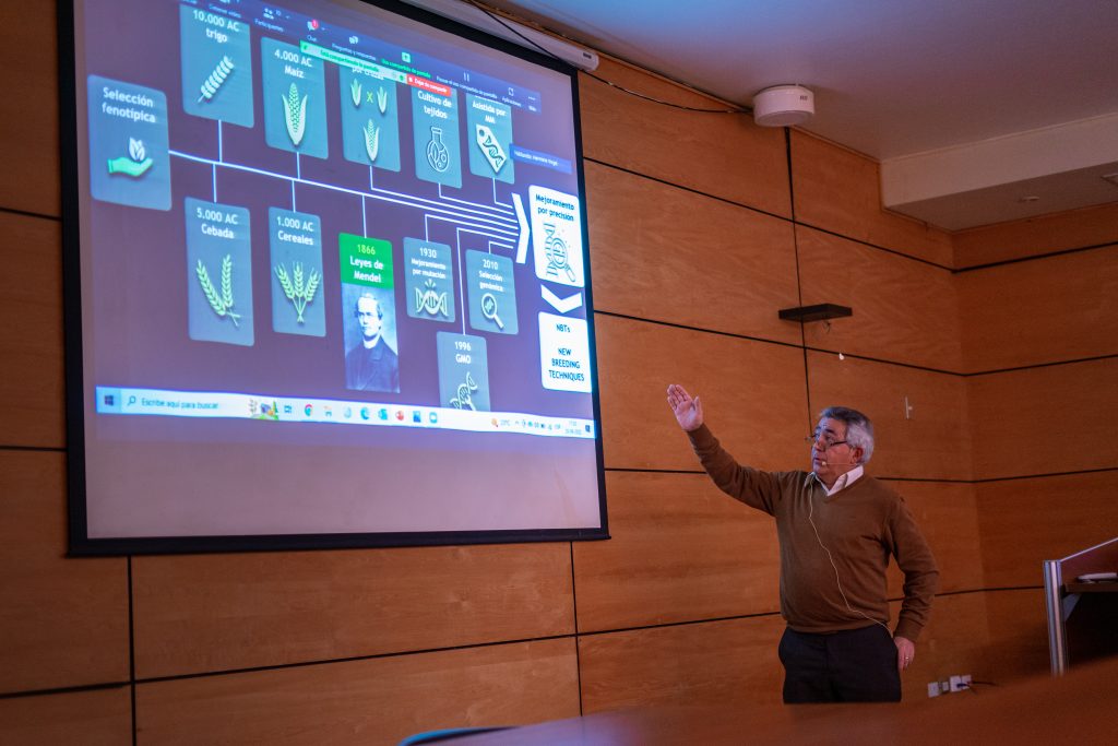 La crisis climática ha puesto en riesgo la seguridad alimentaria del planeta, es por ello que, a nivel mundial, se están buscando e incorporando tecnologías que permitan mejorar la producción agrícola, según explicó Simón Ruiz, director del Instituto de Ciencias Biológicas de la Universidad de Talca, en un encuentro realizado en la Facultad de Ciencias Agrarias de dicha Institución.