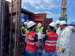 Esto inmediatamente levantó las alertas de los equipos de Aduanas y se hicieron las coordinaciones internacionales respectivas a través del Programa Global de Control de Contenedores (CCP) de la Oficina de las Naciones Unidas contra la Droga y el Delito (UNODC). Con estas gestiones, la Aduana de Bolivia realizó una primera incautación y luego en Chile los equipos de fiscalizadores de la Aduana Regional de Arica detuvieron el resto de los contenedores. También se realizaron coordinaciones con la Unidad de Sustancias Químicas Controladas (USQC) del Ministerio del Interior de Chile y con especialistas del Servicio de Salud de Arica.