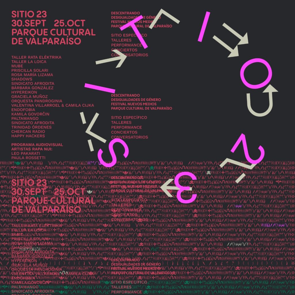El festival de nuevos medios “Sitio 23” comienza el sábado 30 de septiembre a las 15:00 hrs con talleres y un conversatorio a las 16:00 hrs junto al Sindicato Afrodita. Mientras que a las 17:00 hrs la artista Barbara Gónzalez ejecutará la intervención radial performativa “Ventanas al Aire” y continuará a las 18:00 junto al acto en vivo de paltamango y el dj set de ENDOFOBIA, que darán pie a la noche con palabras de Alejandra Ramm, directora del Proyecto Anillo Des-centrando y la actuación en vivo de la reconocida música y DJ Kamila Govorčin. Asimismo desde las 18:00 hrs se dará inicio a la proyección interactiva de grandes dimensiones a cargo de Happy Hackers.