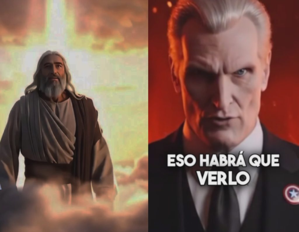 “Tranqui’ Moisés, que Manouchehri y Cicardini presentaron un proyecto de ley”, replica la figura de “Dios”, la que es secundada por un hombre de traje personificando a un republicano, haciendo un guiño a la figura del “diablo”, negando su voto favorable al proyecto.