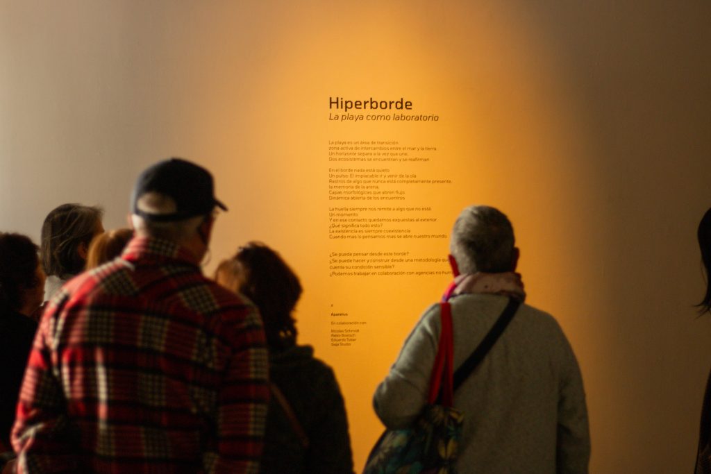 Al grupo de personas mayores les esperaban Catalina Giacamán y Juan Pérez, integrantes del Colectivo Aparalius, con su muestra «Hiperborde: la playa como laboratorio». Una exposición de nuevos medios que aborda de forma inmersiva lo que sucede en esa frontera difusa llamada playa. Las obras que componen esta instalación surgen de una experimentación previa con materiales elegidos por su capacidad de respuesta o memoria; estos registran acontecimientos, recogen datos y buscan dar forma a algunos de los flujos que ahí ocurren.