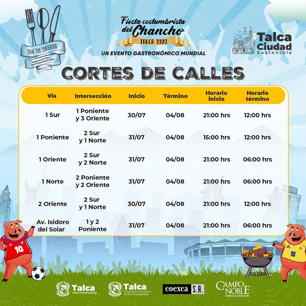 Este martes, la Municipalidad de Talca junto a la Seremi de Transportes y Telecomunicaciones anunciaron los cortes y desvíos de tránsito que se aplicarán en el centro de la ciudad con motivo de la realización de la XV versión de la Fiesta Costumbrista del Chancho, que se celebrará este sábado 2 y domingo 3 de agosto. La medida busca garantizar la seguridad y el correcto desarrollo del evento, que cada año convoca a cientos de miles de visitantes.