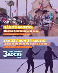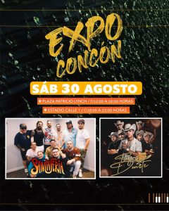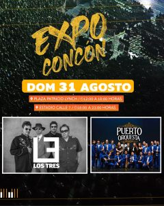 -Sábado 30 y domingo 31, en el Estadio Municipal de calle 7 y la plaza Patricio Lynch, todas las luces, la música, el arte y el emprendimiento de la gran EXPO CONCÓN 2025. Con la actuación de Santaferia, Puerto Orquesta, Benja Duarte, y por primera vez en su formación original, todos los éxitos y trayectoria de LOS TRES.