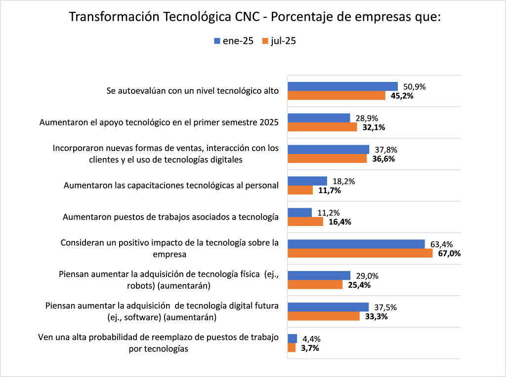 Un 32,1% de las empresas dispuso de más tecnologías durante el primer semestre de 2025 al comparar con el semestre anterior, levemente mayor a lo marcado en enero, destacando las empresas de mayor tamaño con un 61,7%. Un 72,1% de los encuestado dijo utilizar canales de venta en redes sociales, venta en línea o agendamiento, u otro tipo de tecnología digital de interacción con clientes y a su vez un 39,6% dijo haber incrementado estas herramientas en el primer semestre de este año. Por su parte, de aquellos que no utilizan estos canales, un 42,3% piensa hacerlo en el corto plazo.