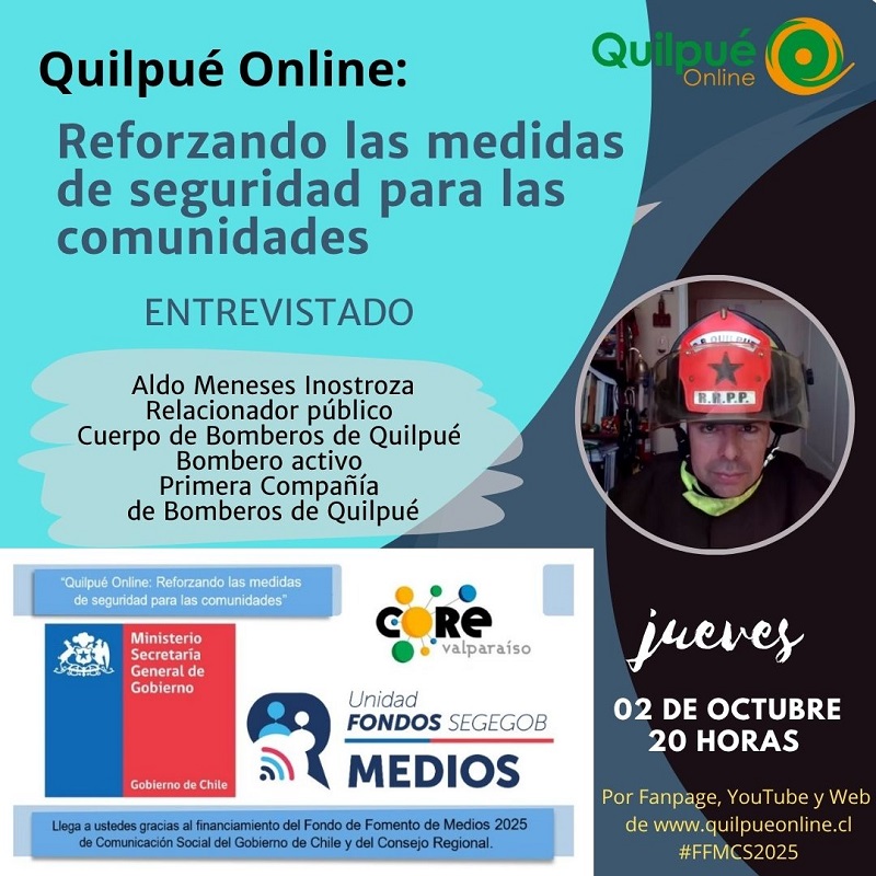 Este jueves 02 de octubre, a las 20 horas, el primer invitado es Aldo Meneses Inostroza, relacionador público del Cuerpo de Bomberos de Quilpué y bombero activo de la Primera Compañía, quien entregará información sobre la valiosa labor de prevención que realiza la prestigiosa institución voluntaria privada y sin fines de lucro, cuyo objetivo principal es salvaguardar la vida y los bienes de la ciudadanía ante emergencias, como incendios, accidentes y desastres naturales.