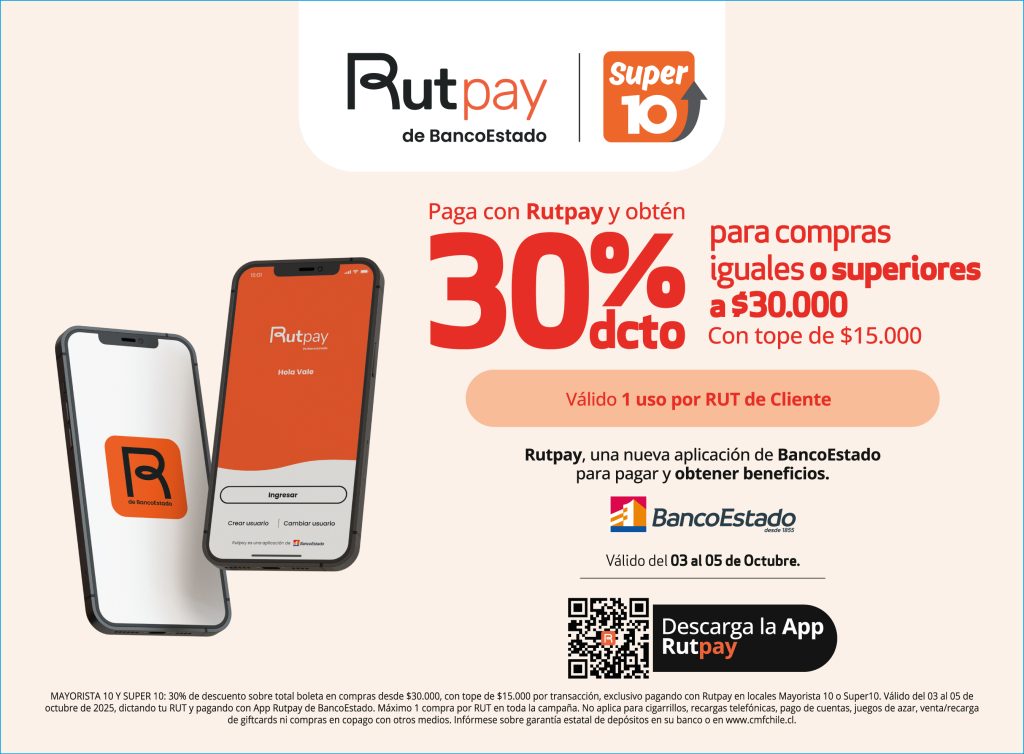 Entre el viernes 3 y el domingo 5 de octubre, los clientes podrán acceder a un 30% de descuento en compras presenciales sobre un monto mínimo en Unimarc, Alvi, Mayorista 10 y Super10, pagando con la billetera digital Rutpay.