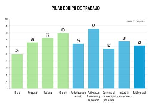 Esta dimensión presenta un promedio de 62 puntos sobre 100, también con una distribución fuertemente estratificada por tamaño empresarial. Las microempresas alcanzan la menor puntuación, con 49 puntos, mientras que las grandes empresas lideran con 80 puntos, generando una brecha de 31 puntos, la más amplia entre los tres pilares analizados.