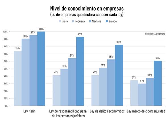 Los datos evidencian, además, una correlación positiva robusta entre el tamaño empresarial y el conocimiento normativo. Las grandes empresas alcanzan niveles de conocimiento cercanos o iguales al 100% en Ley Karin y Responsabilidad Penal (100% y 93% respectivamente), mientras que las microempresas presentan los menores niveles en todas las categorías normativas. Particularmente notable es la brecha en ciberseguridad, donde las grandes empresas triplican el conocimiento de las micro y pequeñas empresas (61% vs. 34% y 30%, respectivamente).