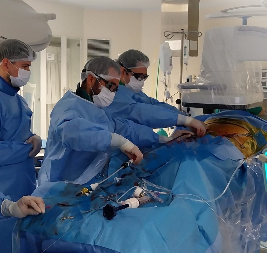 El jefe del equipo de Cirugía Vascular HEP, Dr. Gregory Córdova Aitken, quien lideró esta compleja operación que se prolongó por 7 horas, explicó que “el paciente presentaba un aneurisma que comprometía el origen de las arterias renales o estaba muy pegada a ellas; entonces los dispositivos estándar no aplicaba para este tipo de aneurismas, porque se debía hacer una cobertura o un selle proximal para asegurar una buena exclusion de la enfermedad”.