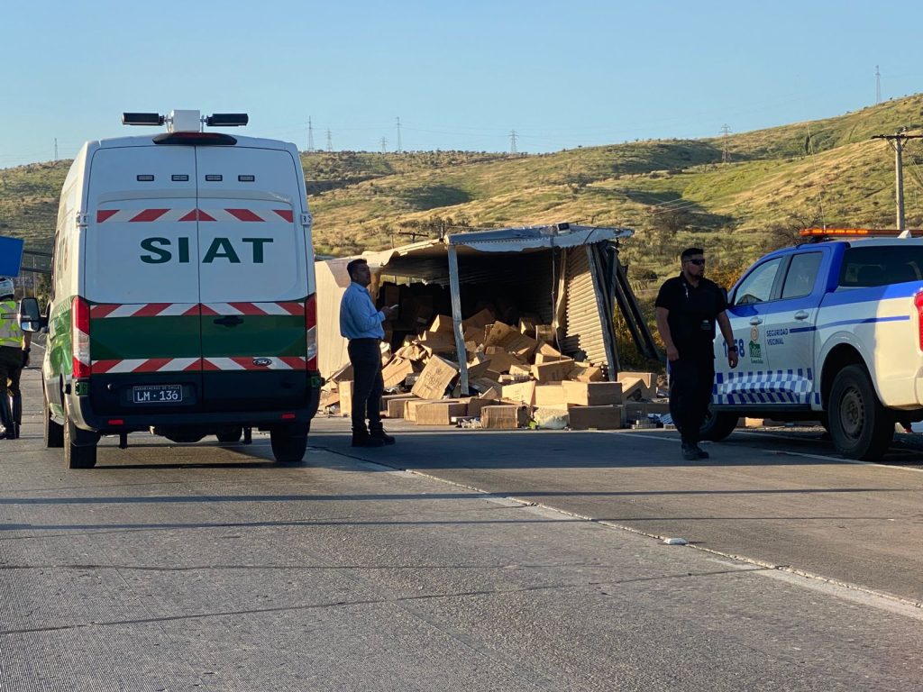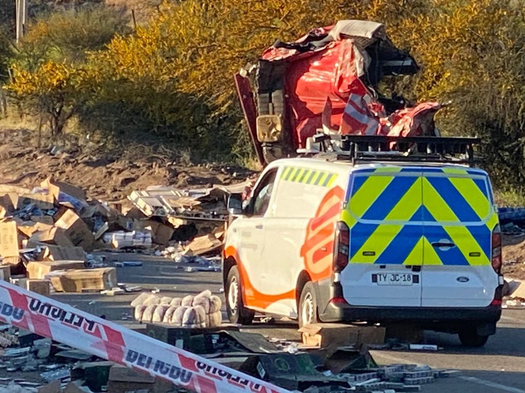 El capitán de carabineros Luis Marchant de la prefectura de tránsito y carreteras confirmó dos muertos, ocupantes de un camion que venía desde el norte de nuestro país y que cruzó el eje de la calzada volcándose en un costado de la vía.
