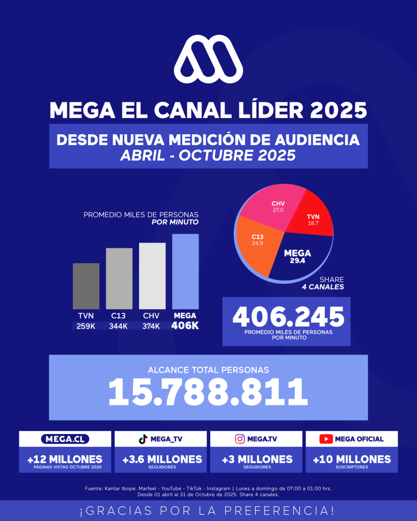 Octubre 2025 marcó el séptimo mes en que opera un nuevo sistema de medición de audiencias en la televisión chilena. De acuerdo con los datos definitivos y oficiales Kantar Ibope, entre el 1 de abril hasta el 31 de octubre, Mega es el canal líder del país con un promedio durante este periodo de 406.245 personas por minuto. Además, Mega suma un alcance total de 15.788.811 personas que se han acompañado de los diferentes contenidos de su programación.