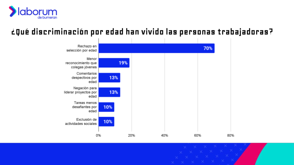 ¿Qué tipo de discriminación por edad experimentaron? El 70% dice haber sido rechazado en procesos de selección, a pesar de cumplir con todos los requisitos y tener la experiencia necesaria para el puesto; el 19% indica haber recibido menor reconocimiento o visibilidad en comparación con colegas más jóvenes; el 13% señala haber sido objeto de comentarios despectivos o burlas por parte de colegas o superiores; otro 13% menciona que se les negó la oportunidad de liderar proyectos o equipos; el 10% dice que se le asignaron tareas menos desafiantes o responsabilidades menores debido a la edad; y otro 10% que indica haber sido excluido de actividades sociales.