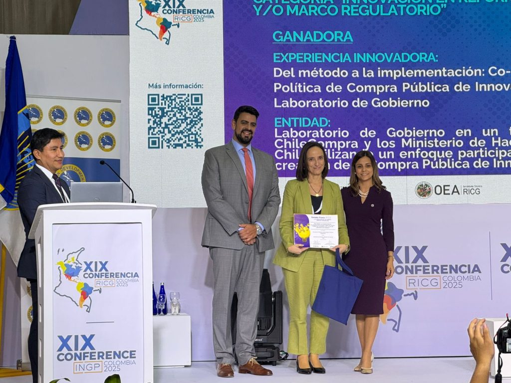 El Laboratorio de Gobierno ha sido galardonado con el Premio Red Interamericana de Compras Gubernamentales 2025 (RICG 2025), en la categoría “Innovación en Reformas Institucionales y/o Marcos Regulatorios por la experiencia “Del método a la implementación: Co-creación de la primera Política de Compra Pública de Innovación (CPI) y el rol del Laboratorio de Gobierno”, una iniciativa conjunta implementada por ChileCompra y el Ministerio de Hacienda, a través del Laboratorio de Gobierno.
