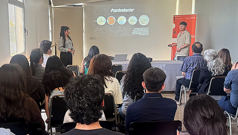 Durante la actividad a cargo de la académica Dra. Valentina González, los expositores, Bárbara Cheuquelén y Esteban Osorio, estudiantes de Ingeniería en Biotecnología, de dicha casa de estudios, compartieron con el público los resultados de sus investigaciones, destacando el valor científico y biotecnológico del ecosistema marino regional y su relevancia frente a los desafíos actuales en materia de resistencia bacteriana. La presentación abordó también la importancia del estudio de microorganismos marinos como fuente de nuevas aplicaciones para la medicina y la protección del medio ambiente.
