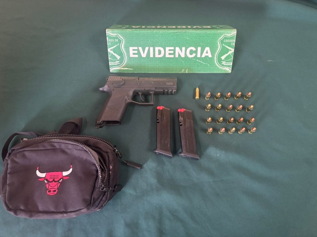 Durante el control, los carabineros advirtieron que desde un bolso tipo banano que portaba la mujer sobresalía la empuñadura de un arma de fuego. Al verificar el contenido, constataron que se trataba de una pistola real, la cual mantenía dos cargadores y munición.