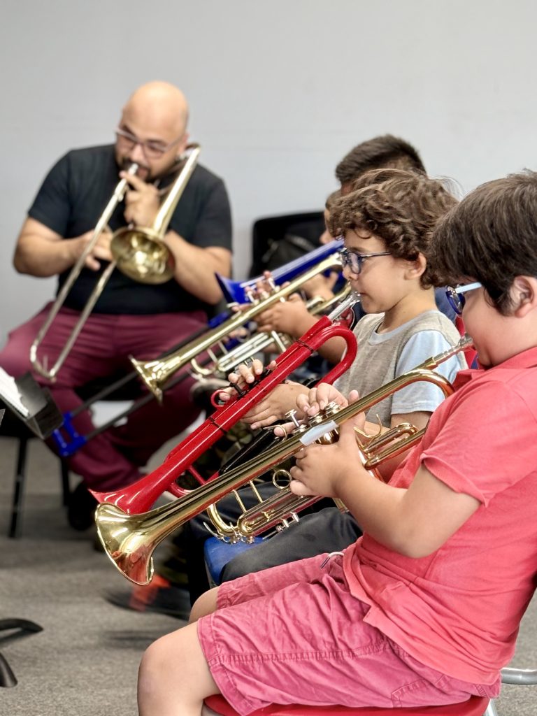 Adair Ramos, instructor de trompeta del Programa de Iniciación Musical Preescolar de FOJI, imparte una cátedra que comenzó este año. En esta oportunidad, enseña a Domingo, Alonso, Adrián y Daniel, niños de entre 5 y 8 años. “Son muy pequeñitos tocando instrumentos. Generalmente se parte más tarde. Con ellos yo trabajo un método de iniciación a los instrumentos de bronce a través del libro Ritmos Latinoamericanos de Daniel Trincado y Rafael Gamboa. Con este texto les enseño desde lo más básico, como la sensación de ritmo. En paralelo, también estoy trabajando la lectura musical”, explicó.