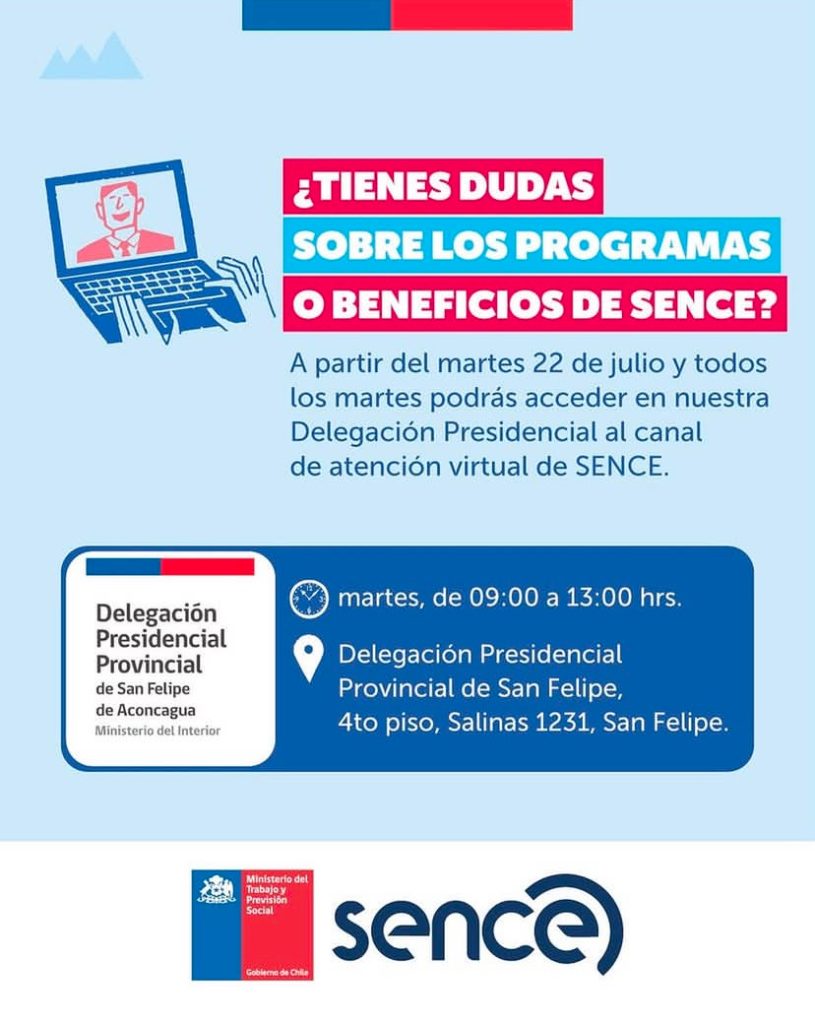 La Delegación Presidencial Provincial de San Felipe recuerda a la comunidad que todos los martes, entre las 09:00 y las 13:00 horas, está disponible en el cuarto piso el servicio de Atención Virtual mediante videollamadas de SENCE, un canal que facilita el acceso a información y orientación sin necesidad de trasladarse fuera de la provincia.