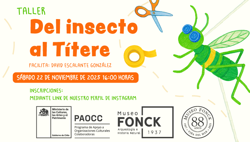 “Del insecto al Títere” es el nombre del taller gratuito que Museo Fonck, ubicado en 4 Norte 784, esquina 1 Oriente, Viña del Mar, realizará el sábado 22 de noviembre de 2025, a las 16:00 horas. Está orientado a un público familiar, en el caso de los menores de 14 años, requieren de la compañía de un adulto.