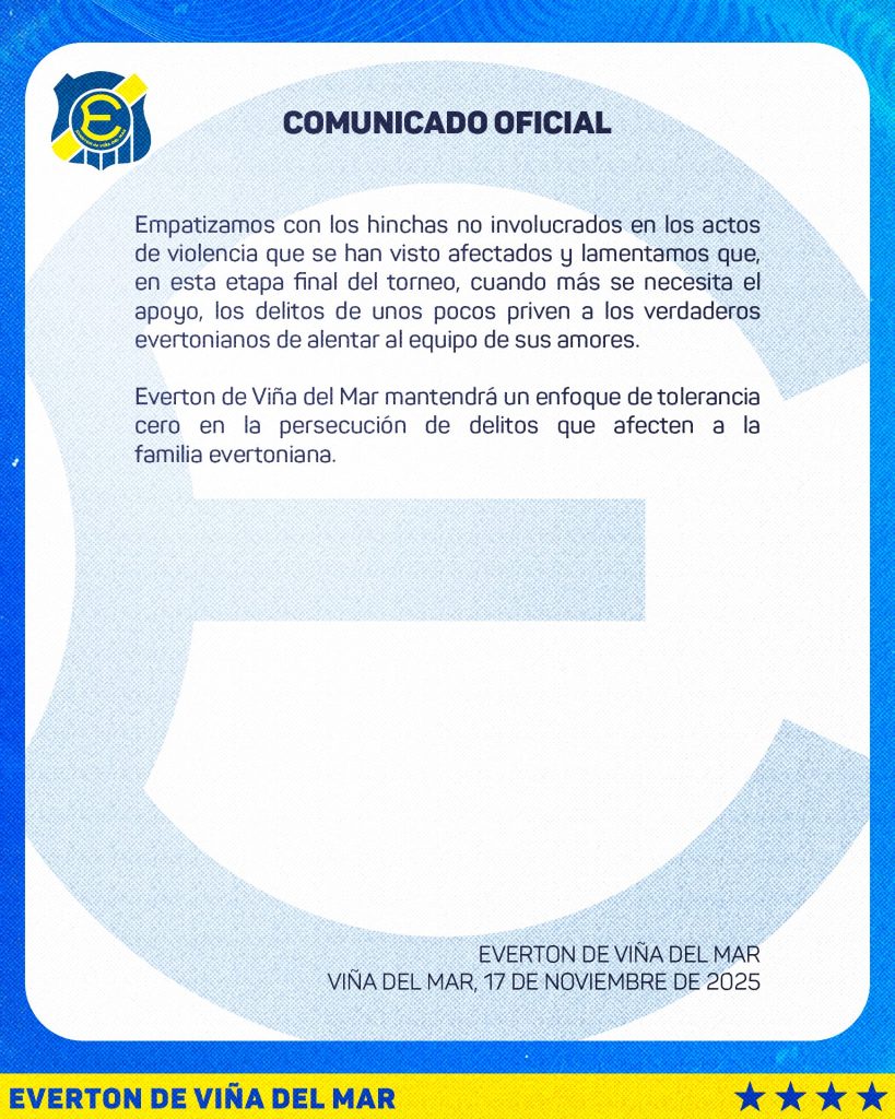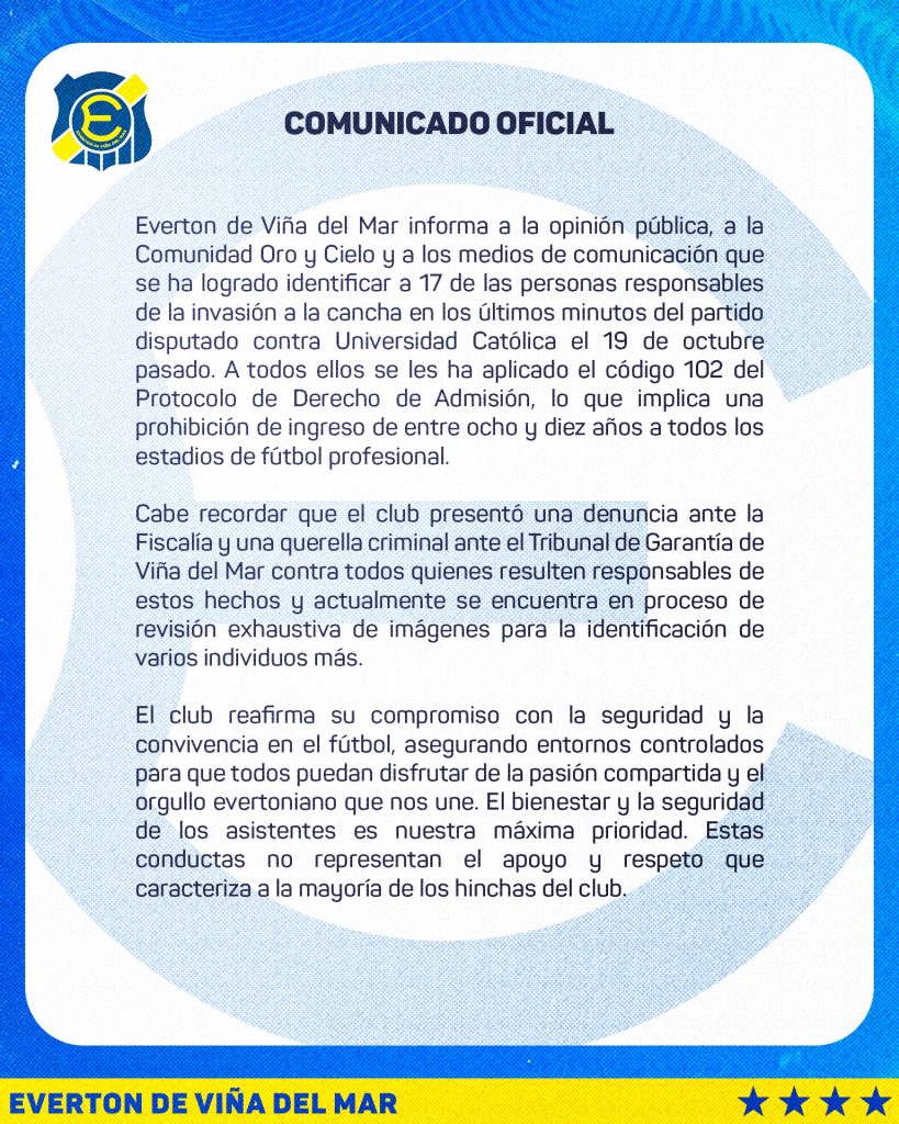A través de un comunicado oficial, Everton de Viña del Mar confirmó que se logró la identificación de 17 sujetos que ingresaron al campo de juego del estadio Sausalito, el pasado 19 de octubre, en los minutos finales del choque entre los oro y cielo y la Universidad Católica.