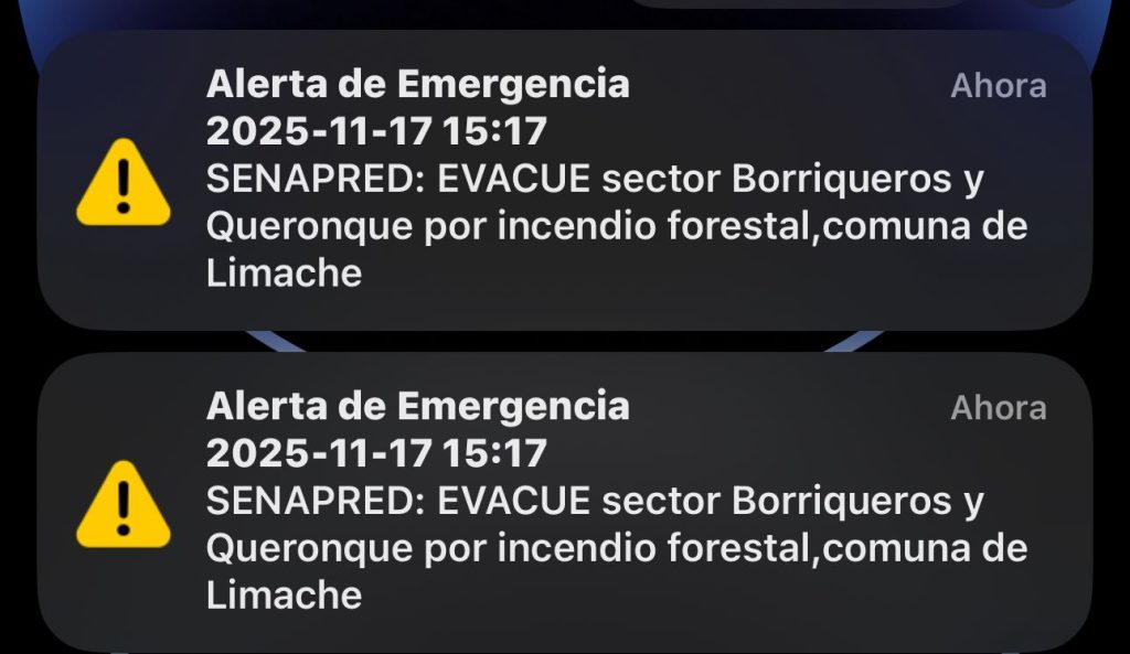 El Director Regional de Senapred, Christian Cardemil, entregó detalles por el incendio forestal en comuna de Limache y sostuvo que «en base a la información técnica provista por CONAF, se ha declarado alerta roja por incendio forestal para la comuna de Limache. Asimismo, se ha activado mensajería SAE para reforzar el proceso de evacuación de los sectores denominados Borriqueros y Parcelación Queronque, proceso que ya fue iniciado por el personal municipal».