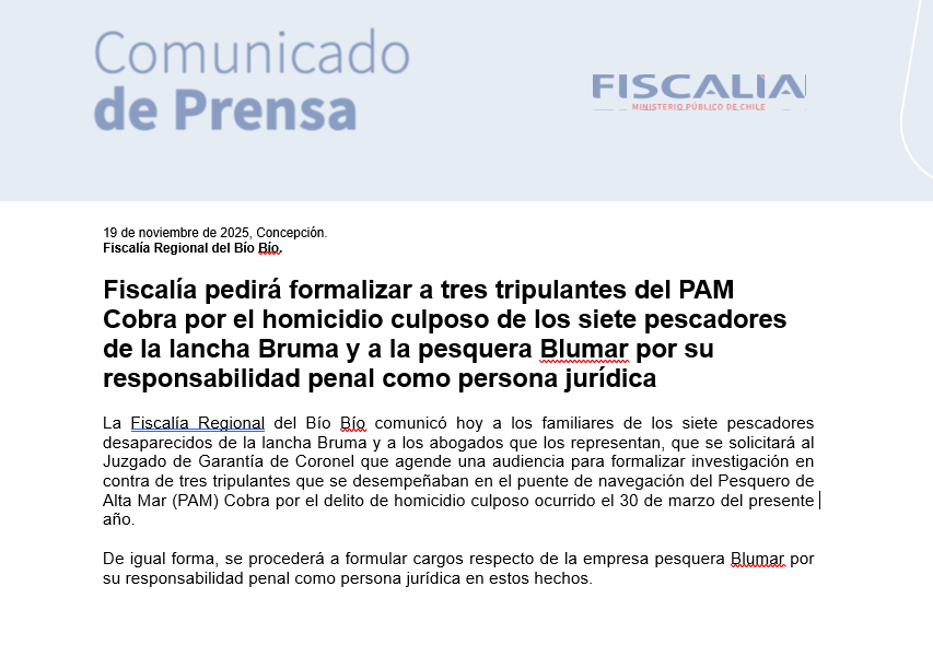 Hace poco minutos y a través de un comunicado, la Fiscalía de la Región del Biobío confirmó que formalizará a tres tripulantes del puente de navegación del Pesquero de Alta Mar «Cobra» por homicidio culposo de los siete pescadores de la lancha «Bruma».