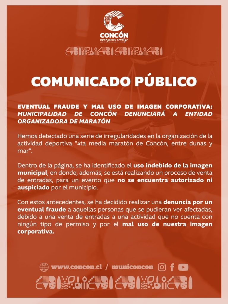 A través de una declaración pública, el municipio de Concón indicó que «tras detectar una serie de irregularidades en la organización de la actividad deportiva ‘4ta media maratón de Concón, entre dunas y mar’, se ha decidido realizar una denuncia por eventual fraude, a aquellas personas que se pudieran ver afectadas, debido a una venta de entradas a una actividad que no cuenta con ningún tipo de permiso».
