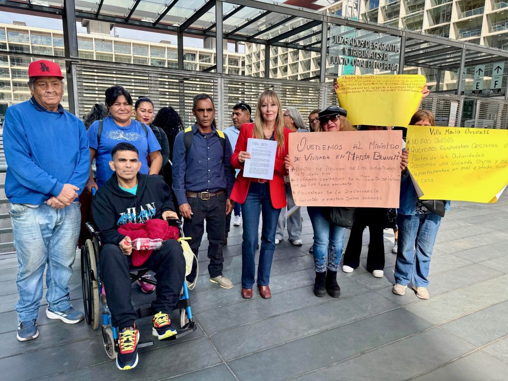 La diputada Ana María Gazmuri anunció la presentación de estas acciones en el Centro de Justicia, acompañando a los vecinos de la población Marta Brunet, en Bajos de Mena, comuna de Puente Alto. «Hoy estamos aquí en el Centro de Justicia para cumplir una promesa», señaló la parlamentaria, recordando que hace más de seis meses se reunió con dirigentes vecinales y conoció la difícil situación que atraviesan las familias, víctimas de engaños, cobros indebidos y amenazas, mientras esperan desde hace más de diez años la vivienda justa que les prometieron en el marco del proyecto de regeneración urbana iniciado en 2016.