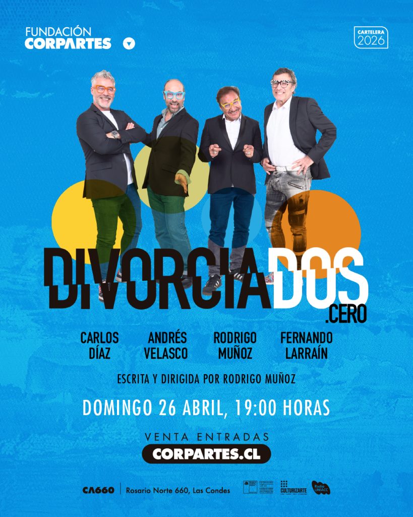 La obra de teatro “Divorciados 2.0” se presentará el domingo 26 de abril a las 19:00 horas, en el Teatro CA660 de Fundación CorpArtes, ubicado en Rosario Norte #660, piso -2, Las Condes. Las entradas se pueden adquirir en www.corpartes.cl y los valores van desde los $23.000 hasta los $33.000, desde 15% de descuento para estudiantes, tercera edad y convenios. Entradas en preventa con un 20% de descuento hasta agotar stock por sector.