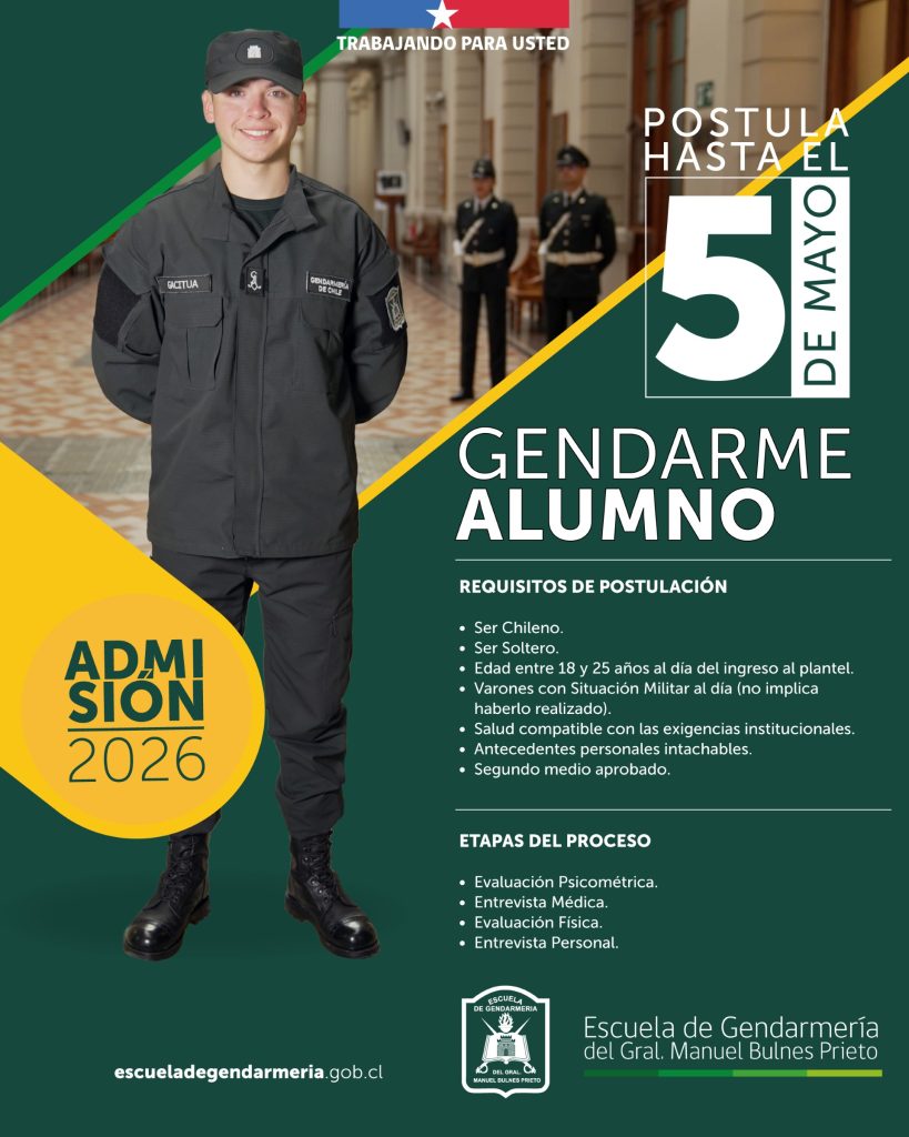 Gendarmería de Chile hace un llamado a jóvenes varones entre 18 y 25 años que deseen formar parte de la Institución, en un momento clave para el fortalecimiento de la seguridad del país.