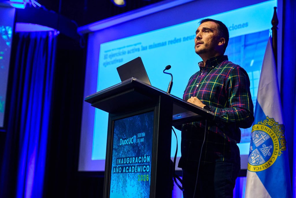 Con un llamado a incorporar la actividad física para mejorar la actividad cerebral, Duoc UC sede Viña del Mar inauguró su año académico junto a la Escuela de Salud y Bienestar. La jornada contó con la participación del investigador Carlos Cristi Montero, docente de la Pontificia Universidad Católica de Valparaíso, quien dictó la charla “Moverse, la mejor decisión de tu vida para cuidar el cerebro”.