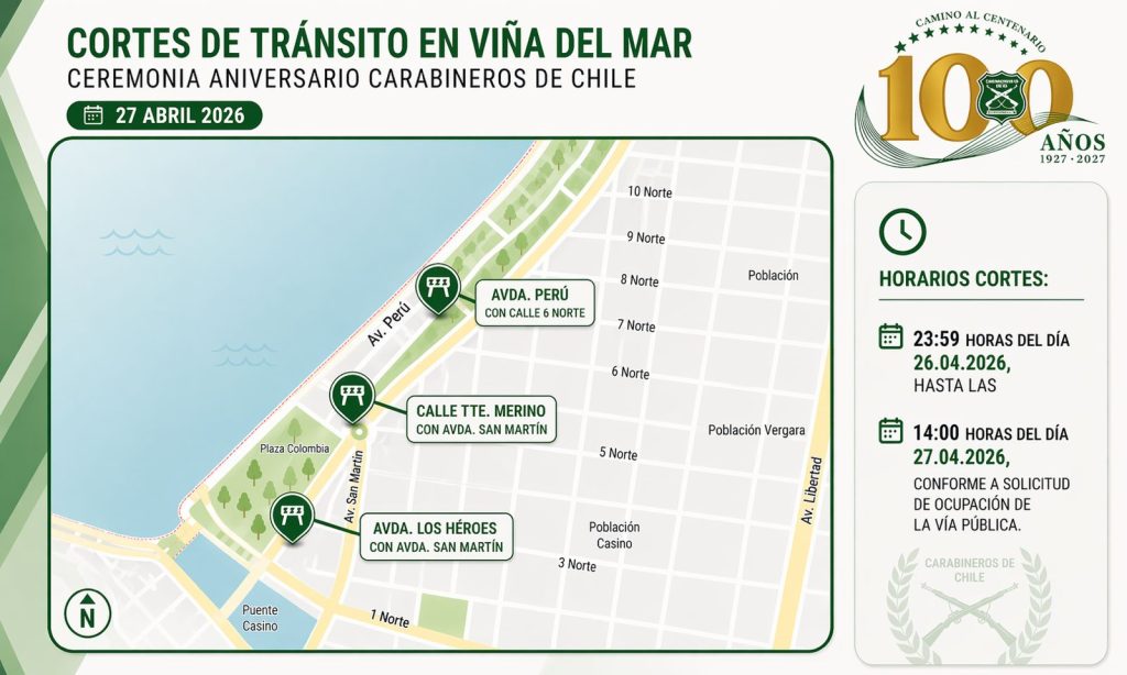 Este lunes 27 de abril, Carabineros de Chile conmemorará sus 99 años de vida institucional con una ceremonia y desfile cívico militar que se desarrollará en Avenida Los Héroes de Viña del Mar, desde las 11:00 horas.