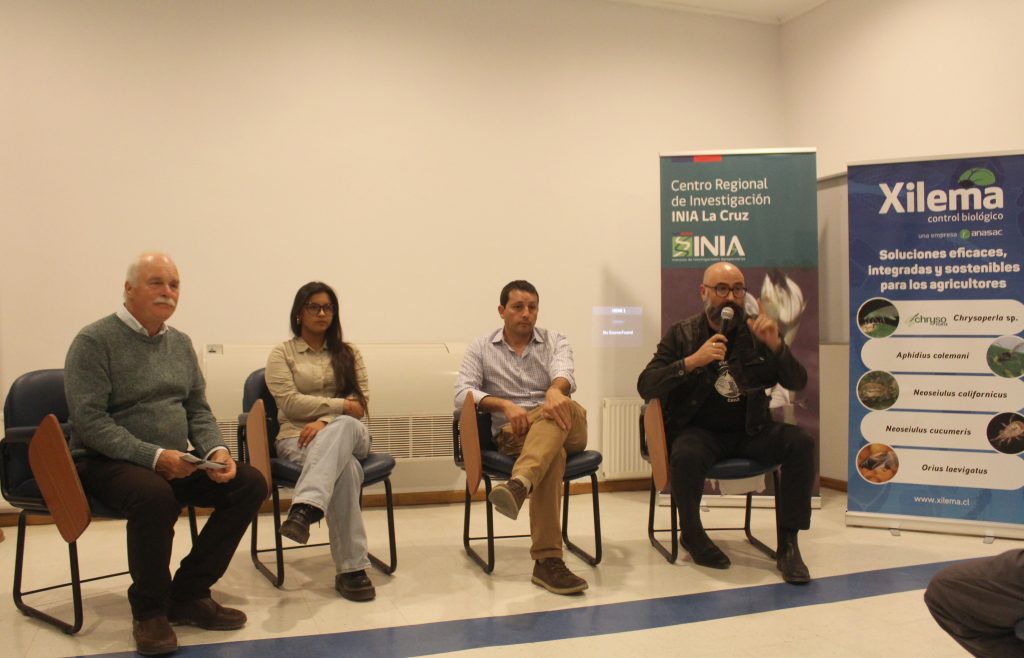 El investigador de INIA Remehue, Claudio Salas Figueroa, presentó la charla “Control biológico en Chile tras 120 años: avances, aprendizajes y proyecciones”. Salas destacó que el país cuenta con una larga tradición en esta materia, pero que hoy se vive un momento crucial: “Chile tiene 120 años de control biológico y estamos en un momento preciso, porque hay una mejor percepción de la ventaja de utilizar enemigos naturales para controlar una plaga frente a un producto químico. Hicimos este seminario para fomentar entre técnicos y agricultores las ventajas de esta tecnología, que es de bajo costo y tiene bajo impacto ambiental, favoreciendo los agroecosistemas”.